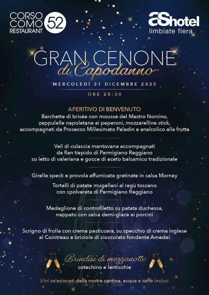 Gran Cenone di Capodanno servito in tutti gli ambienti del Ristorante Corso Como 52, con musica e intrattenimento per un’esperienza coinvolgente.
